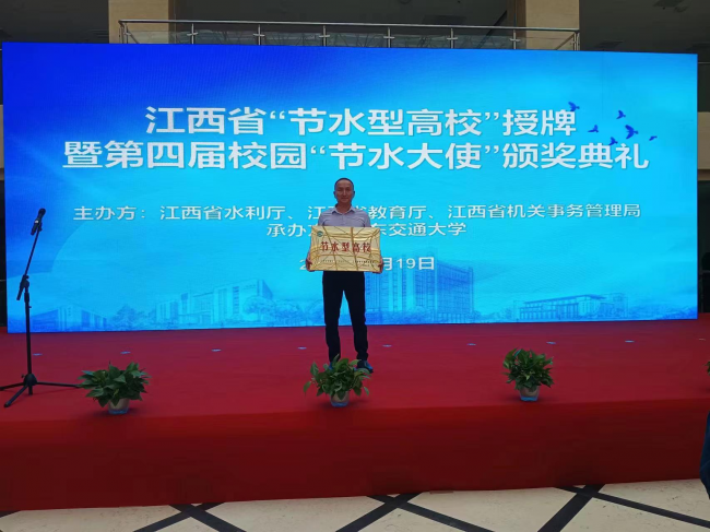 5月19日,由省水利厅、省教育厅和省机关事务管理局联合举办的江西省“节水型高校”授牌暨第四届校园“节水大使”颁奖活动在华东交通大学举行,省政府副省长卢小青,省政府副秘书长、省机关事务管理局党组书记、局长严佛元,省水利厅党委书记、厅长罗传彬,省委教育工委委员、省教育厅副厅长汪立夏,华东交通大学校党委书记柳和生出席此次活动,beat365受邀参加授牌仪式和颁奖活动,后勤产业处黄建新处长代表beat365参加授牌仪式。