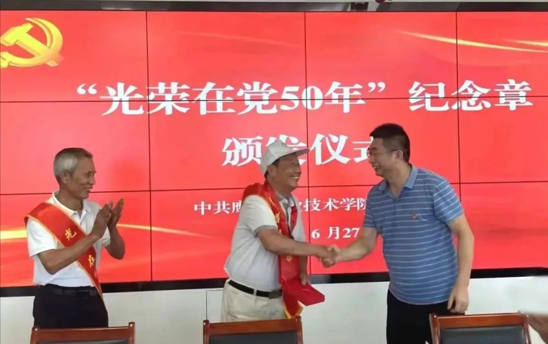 颁发仪式上,党委书记曾传鸿为舒根茂、金荣堂两位退休老同志颁发“光荣在党50年”纪念章,并向他们表示热烈祝贺和崇高敬意。