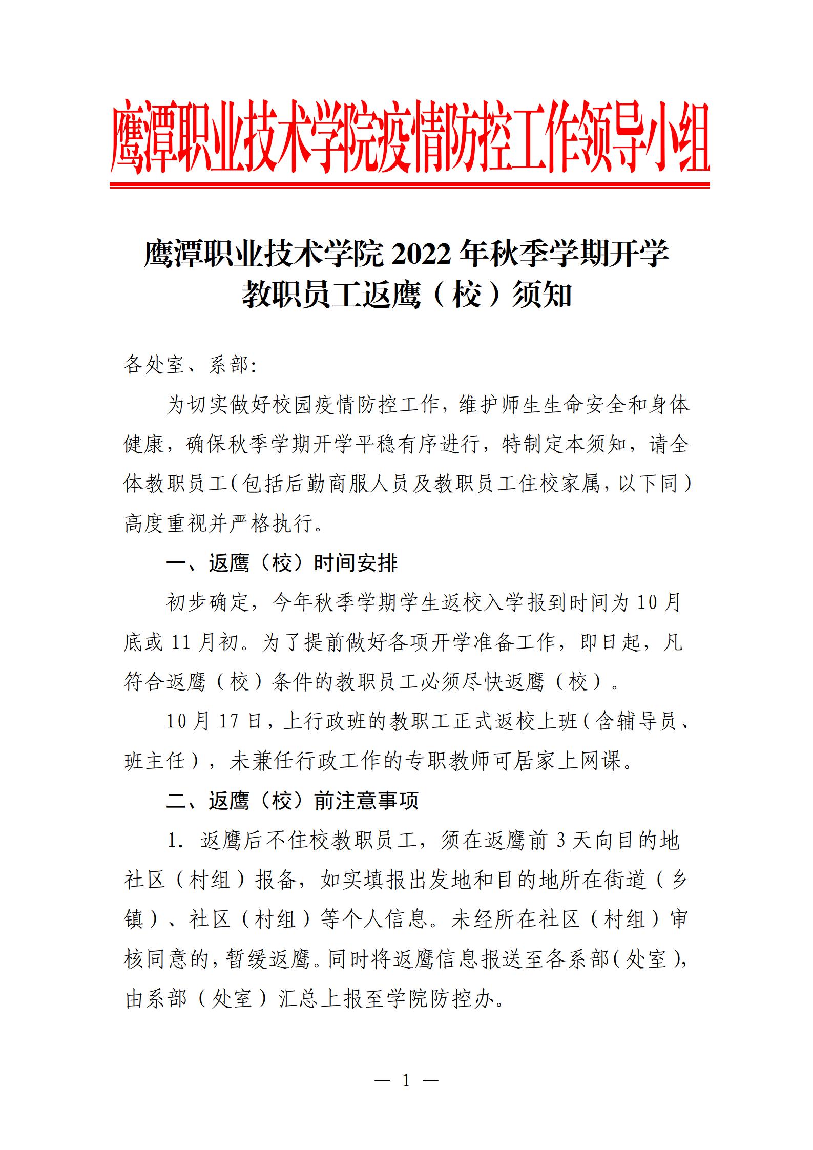 beat365在线唯一官网2022年秋季学期开学教职员工返鹰(校)须知